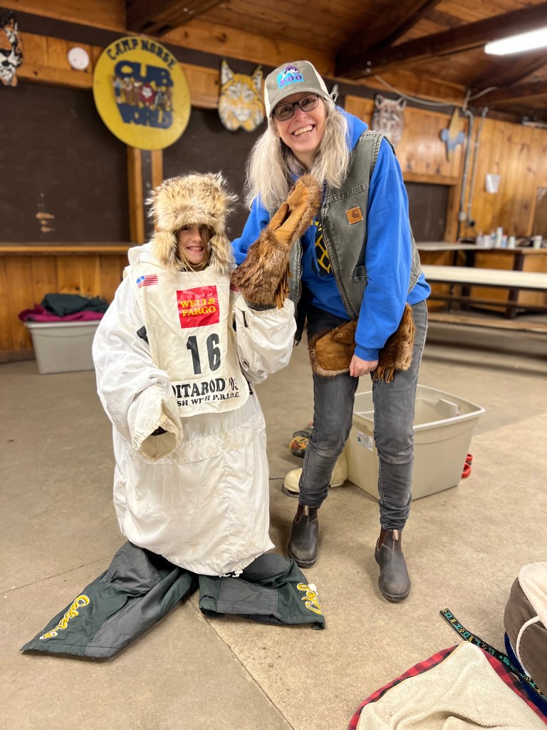 Karen Land and her dog team at the 2002 Iditarod Start Line, Anchorage, Alaska. Pig (R) and Gnome (L) in lead. Photo credit: Jeff Schultz