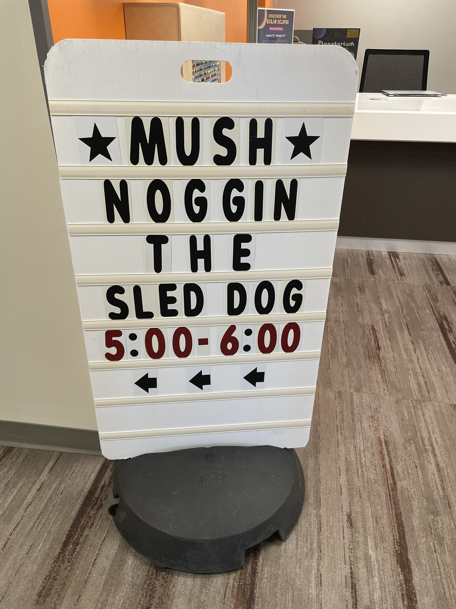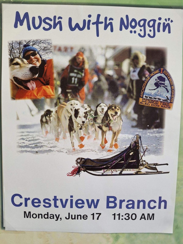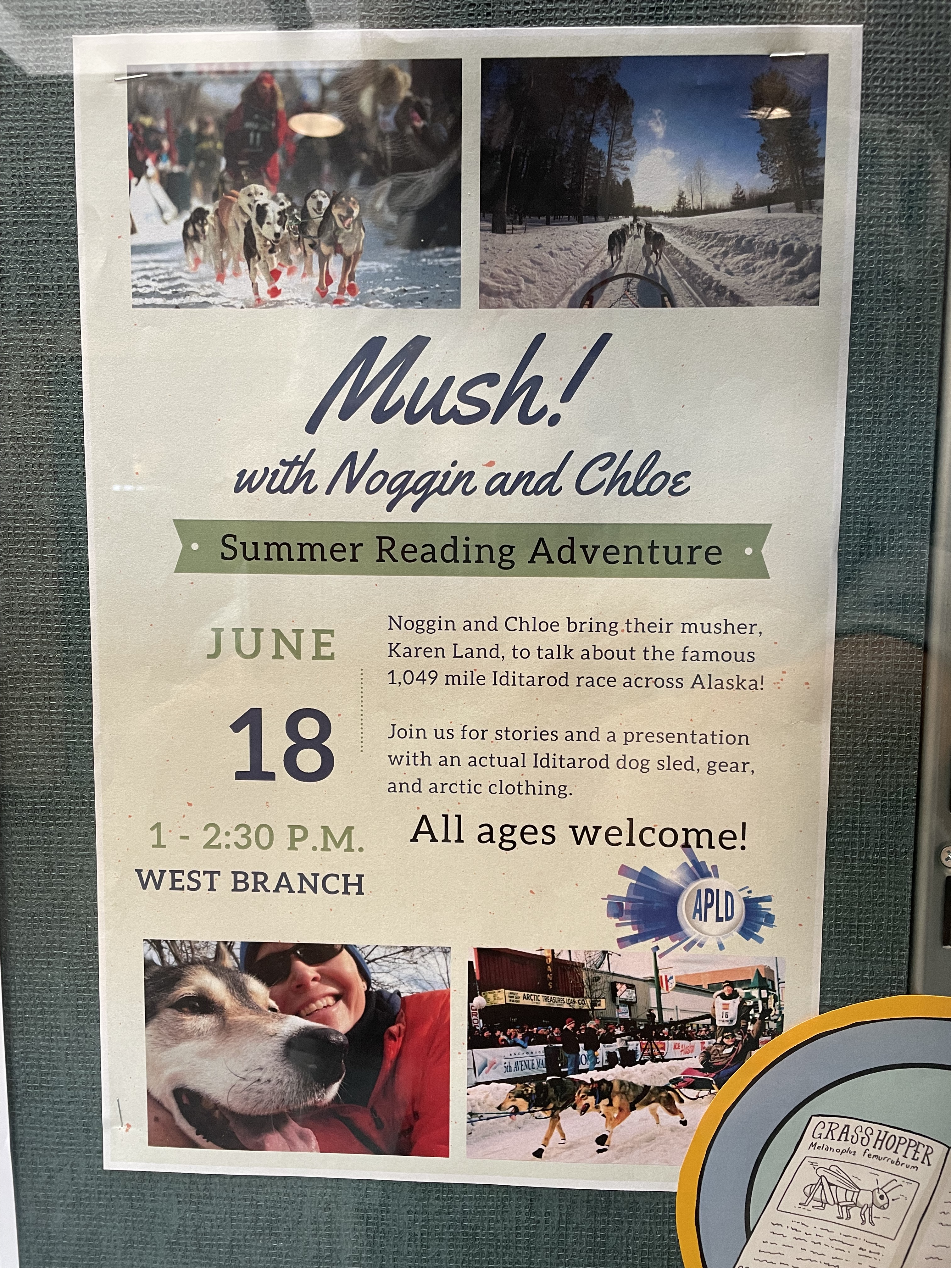 After so many great photos, what else needs to be said??? We had an awesome Summer Reading road trip, visiting public libraries in Indiana, Illinois, Ohio, Michigan, Kentucky, West Virginia, and Tennessee. 60 total talks! THANK YOU to all of the enthusiastic and devoted public librarians out there who put together another amazing Summer Reading season. YOU ARE APPRECIATED! And thank you to everyone who came out to learn about the exciting sport of dog mushing and visit with Noggin and me. We love the opportunity to make new friends and learn more about the communities we visit. Noggin can’t wait for the next tour! Email us now to book a talk—we are already scheduling for Winter-Spring 2025 and even 2025 SUMMER READING!