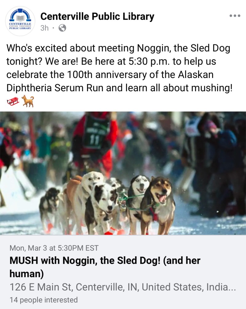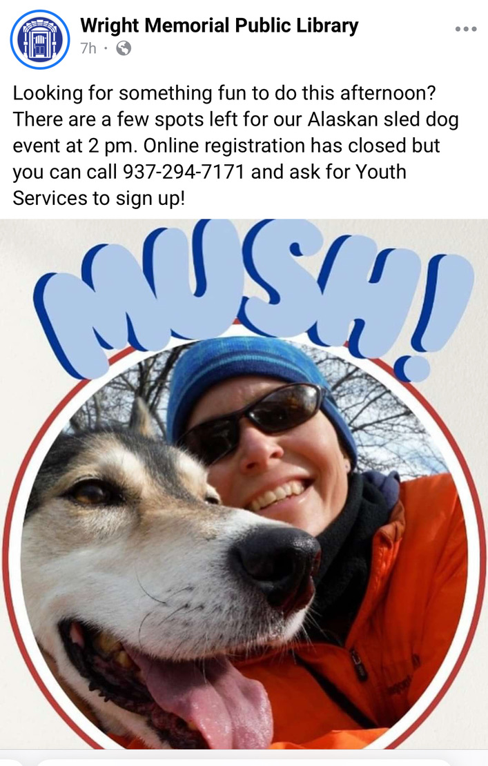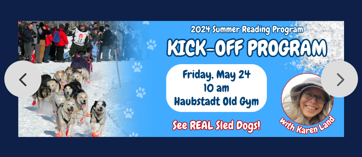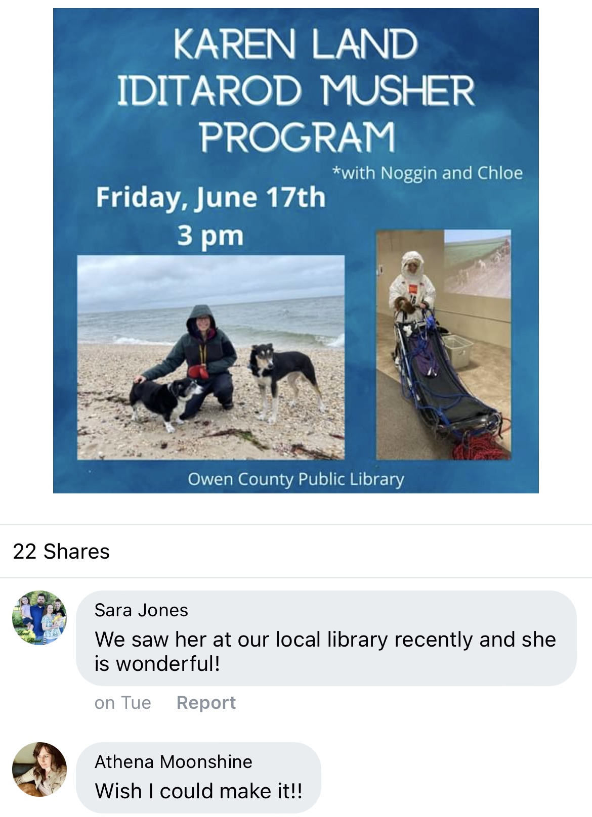 After so many great photos, what else needs to be said??? We had an awesome Summer Reading road trip, visiting public libraries in Indiana, Illinois, Ohio, Michigan, Kentucky, West Virginia, and Tennessee. 60 total talks! THANK YOU to all of the enthusiastic and devoted public librarians out there who put together another amazing Summer Reading season. YOU ARE APPRECIATED! And thank you to everyone who came out to learn about the exciting sport of dog mushing and visit with Noggin and me. We love the opportunity to make new friends and learn more about the communities we visit. Noggin can’t wait for the next tour! Email us now to book a talk—we are already scheduling for Winter-Spring 2025 and even 2025 SUMMER READING!