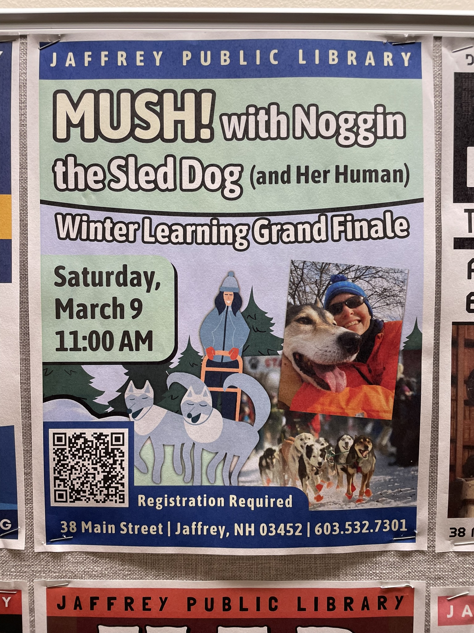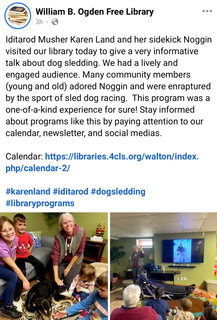My 24th year of dog mushing talks is off to an exciting and enthusiastic start! In the first three months of 2024, we’ve given over 40 talks in Indiana, West Virginia, New Hampshire, Vermont, Massachusetts, and New York (not to mention the busy 2023 Autumn tour in North Carolina). Thank you to the librarians and teachers who hosted us as well as all of the students, patrons, and dog lovers who made us feel at home in your communities. This lovely little article written by Nathan Bagster sums up why we love doing what we do, and why we plan to keep on spreading that beautiful sled dog spirit…