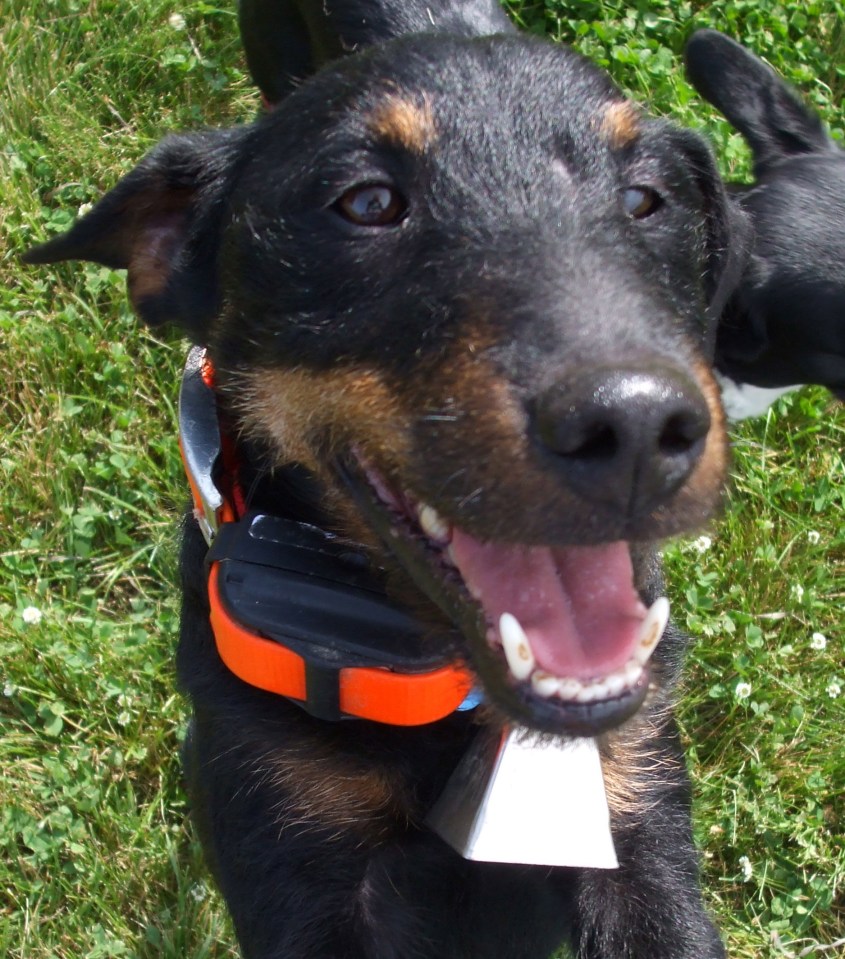 Next → Our model German Jagd Terrier, Jigs, is feeling quite sporty, wearing a blaze orange collar accessorized with a receiver by Tritronics and a silver cow bell. DSCF0321 Leave a comment Cancel reply Δ