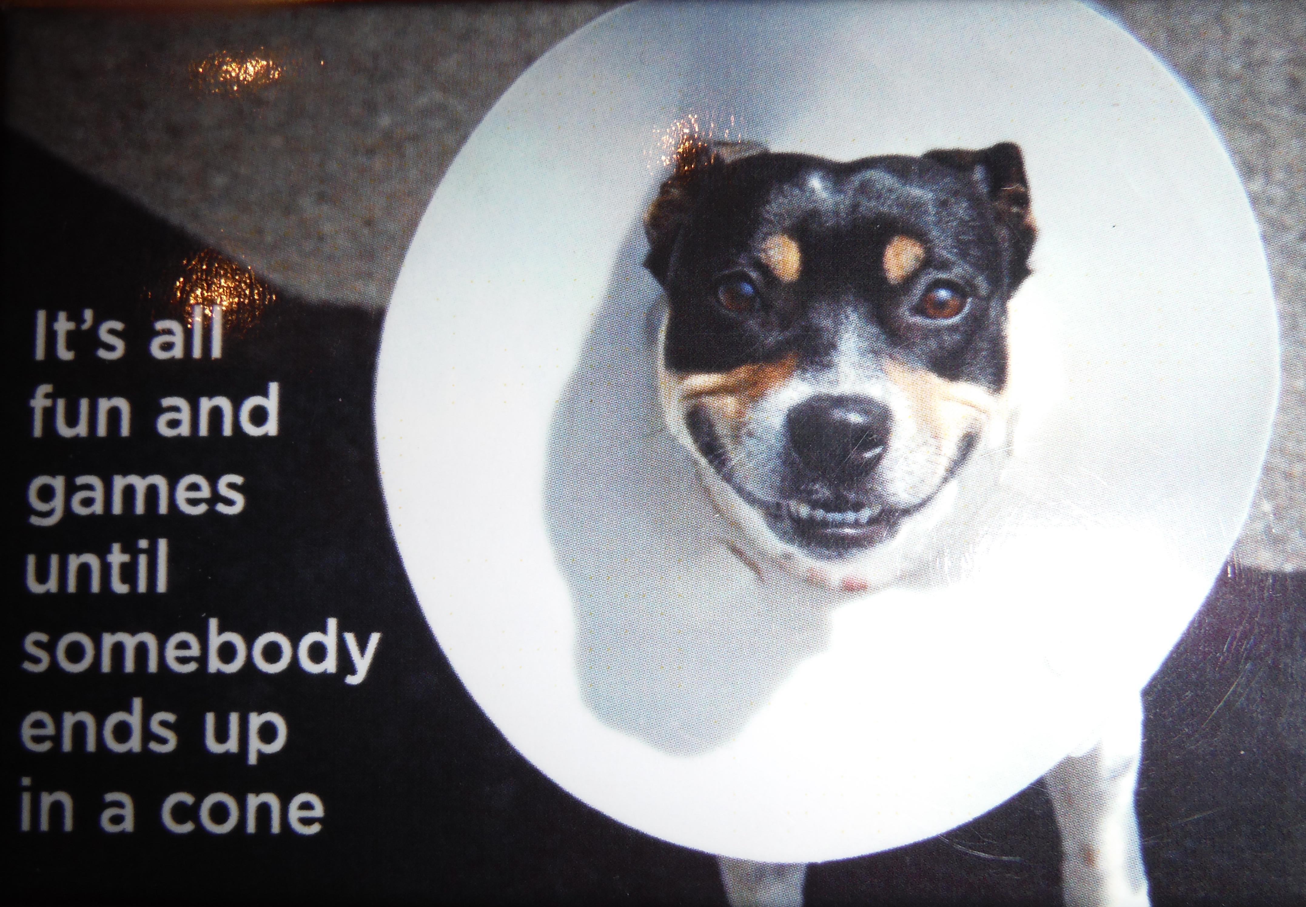 A magnet stuck to the bottom of my refrigerator door says: “It’s all fun and games until somebody ends up in a cone.” When my friend, Brenda, and I spotted this Truth next to a photo of a terrier haloed by the giant white “cone of shame,” we both laughed. In my world, this scene is all too familiar. I, literally, own 13 e-collars (FYI… it’s never a good idea to spay or neuter 13 crazy sled dogs all on the same day… but that’s another story). Sadly, my 25-lb. German Jagd Terrier, Jigs, has ended up in the “cone of shame” more times than all of my sled dogs combined. “You need this…” Brenda said, pulling the magnet off the counter display at the bookstore and handing it to the cashier. “Hang it really low on the frig… so The Terri-orist can see it.”